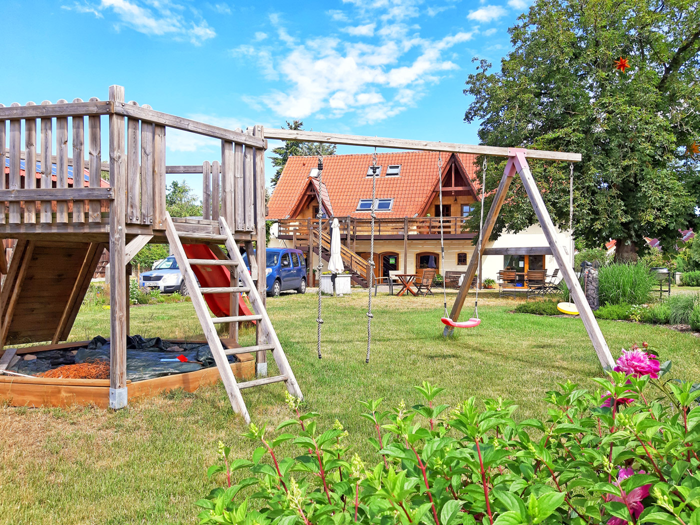 Die hellen und freundlichen Wohnungen befinden sich im Obergeschoß eines rekonstruierten Stallgebäudes und sind über einen Laubengang erreichbar. Sie bieten Platz für jeweils zwei Erwachsene und ein bis zwei Kinder. Sie bestehen aus einem Wohn- und einem Schlafzimmer sowie einem Bad. Die Küche ist durch ein Fachwerk-Element vom Wohnbereich getrennt.