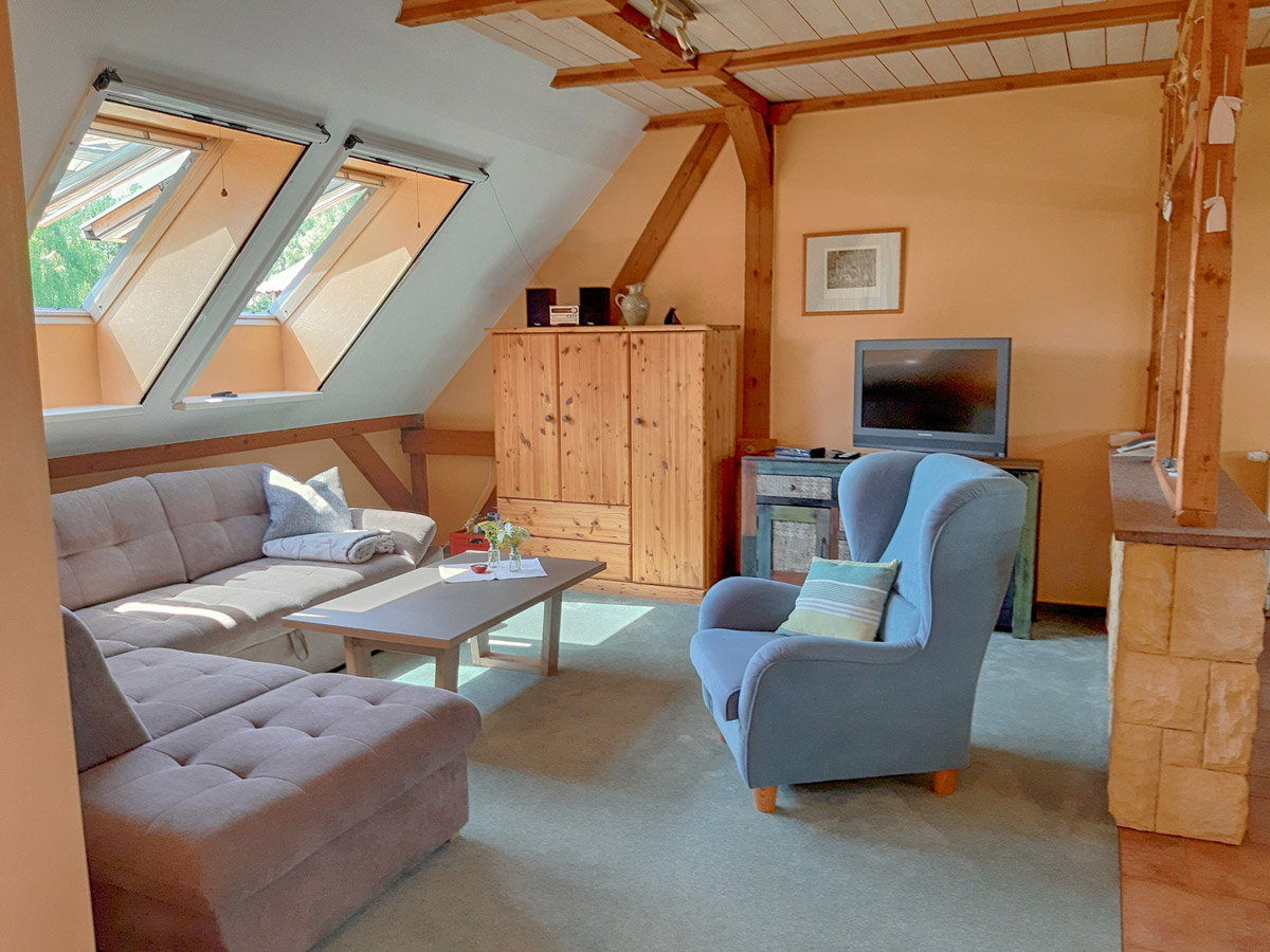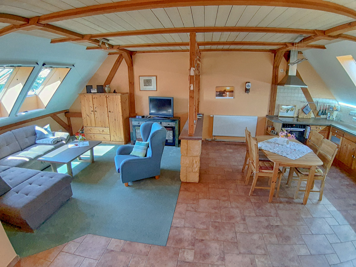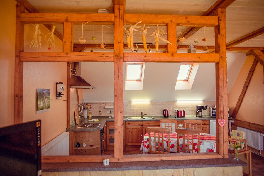 Auch hier genießen Sie den Blick auf die Sterne direkt unter dem Dach im oberen Schlafzimmer mit einem Doppelbett und einem Kinderreisebett. Damit eignet sich die Wohnung für zwei Erwachsene und zwei Kleinkinder. Das zweite Kind wird auf einem Zustellbett nächtigen. Im unteren geräumigen großen Wohn- und Küchenbereich ist eine gut ausgestattete Küche mit Kühschrank, E-Herd und Geschirrspüler integriert. Der Küchenbereich ist mit einem Fachwerk zum Wohnbereich getrennt. Im Raum neben dem Wohnbereich ist das Bad mit Dusche und WC.