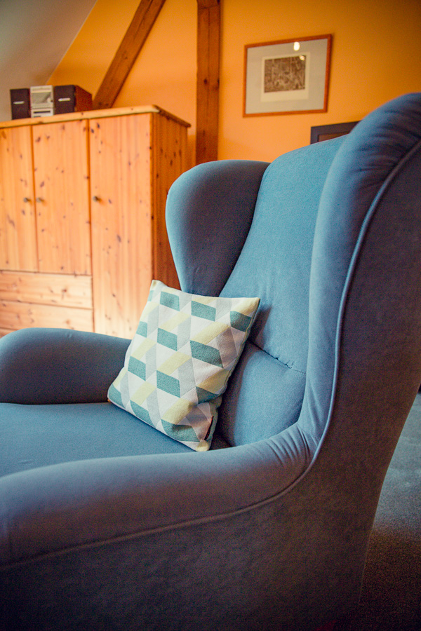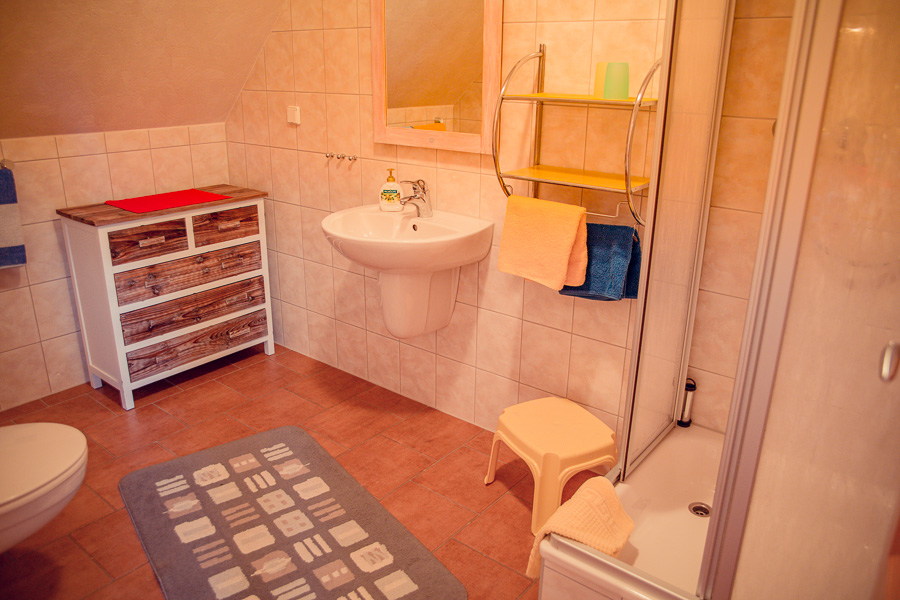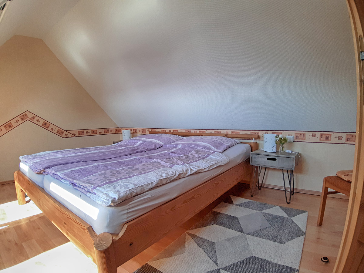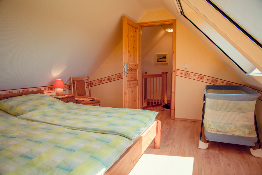 Im Dachgeschoss haben wir das Schlafzimmer mit einem Doppelbett ausgestattet. Je nach Belegung wird ein Kinderbett oder ein Zustellbett bereitgestellt. Es ist auch möglich beide Varianten unterzubringen. Dadurch ist diese Ferienwohnung für eine Familie mit zwei Kleinkindern geeignet.